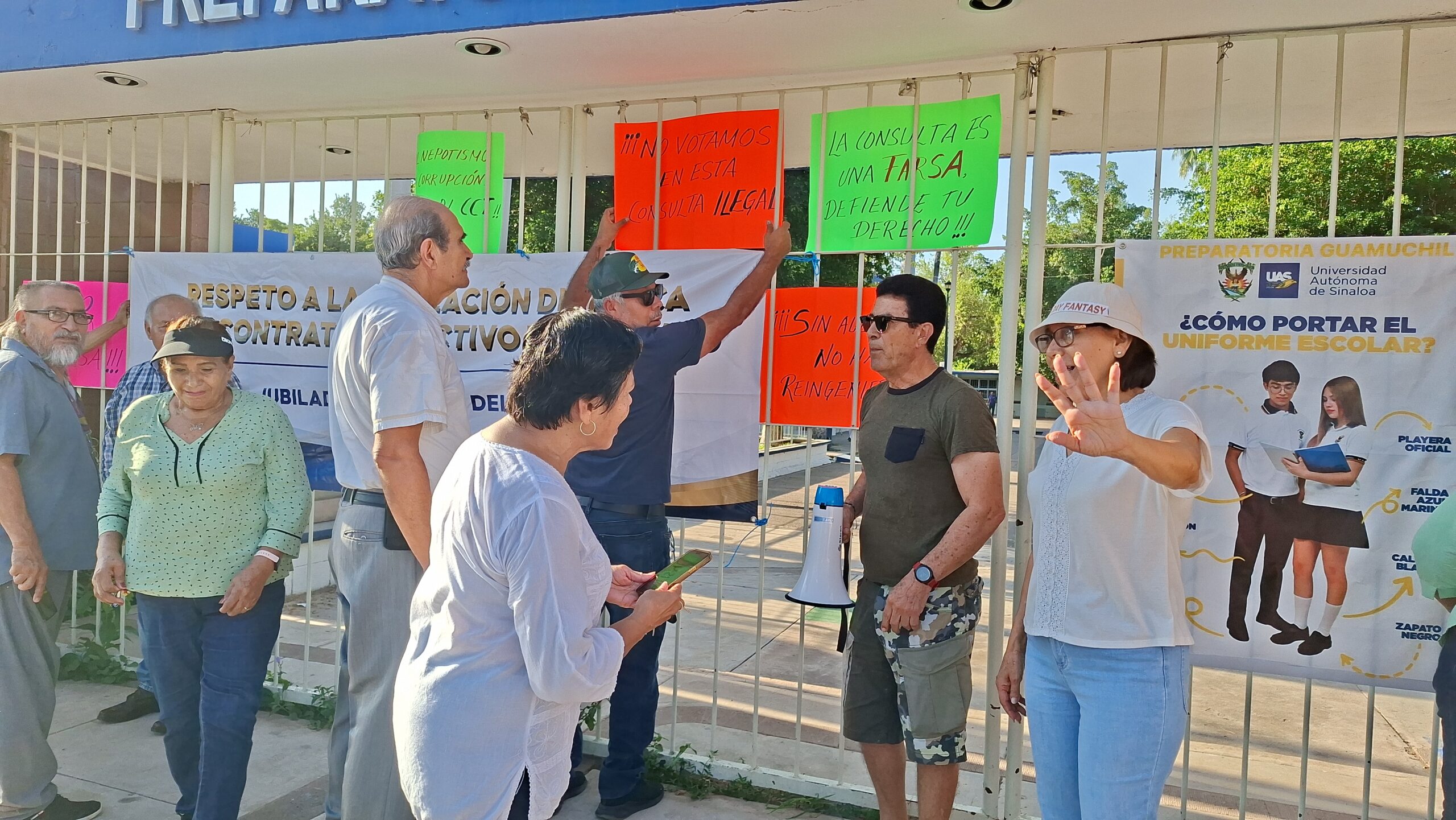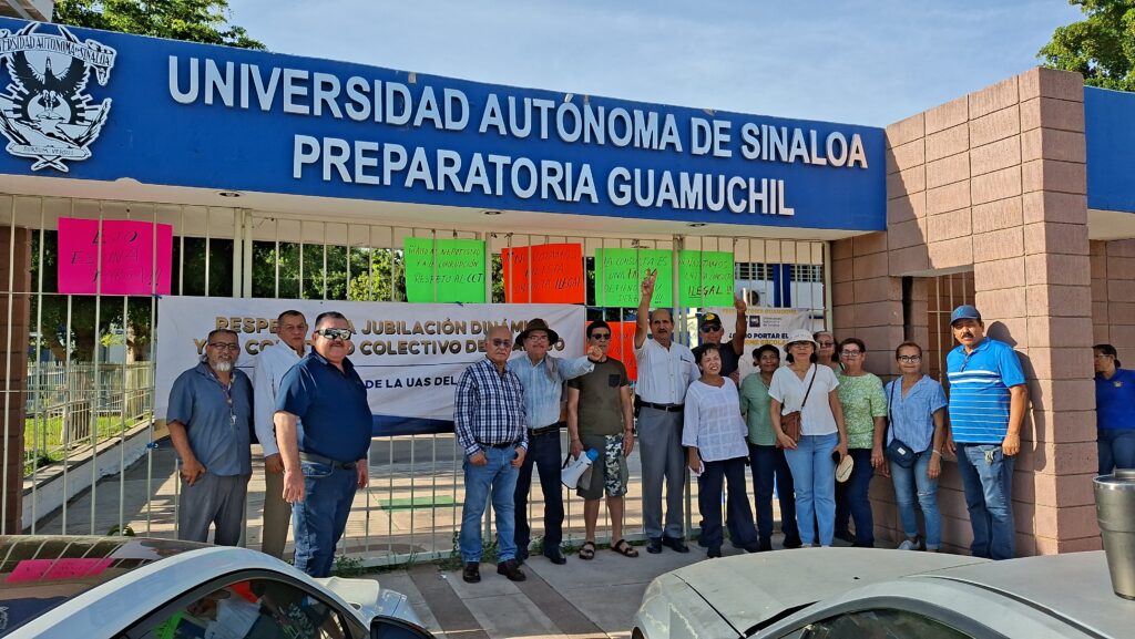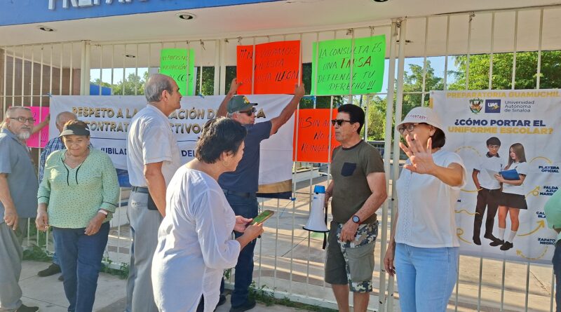 Guamúchil, Sinaloa.- La tensión en la Universidad Autónoma de Sinaloa subió de tono. Un grupo de jubilados se plantó frente a la Preparatoria Guamúchil para alzar la voz contra la propuesta de reingeniería universitaria que pretende aplicar la rectoría, y que contempla retenciones de hasta un 20 % al salario de los trabajadores para garantizar el esquema de jubilación dinámica.